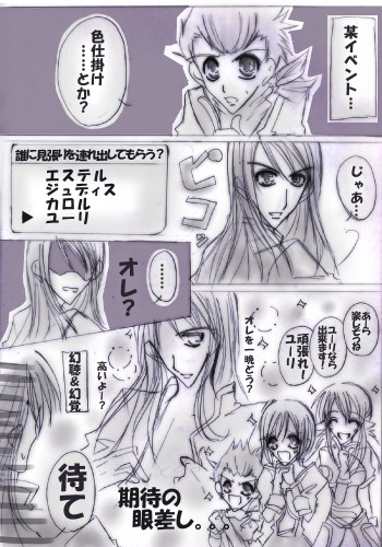 Gypsophila elegans幸兎のゲーム関連メモブログです。RPGや乙女ゲームがメインに愛に偏った語りをつらずらと他にもらくがきがアップされてたりします。あくまでもプレイ語りメモで攻略ブログではないです。ネタバレを多数含みますので未プレイの方はご注意!BL寄り語りも含まれるのでその辺が苦手な方もご注意!リンクはフリーです2009.09.23 Wed 21:27:19 レポ5フレンが婿に来た(…違います) そんなあたしはやはりフレユリ派っぽい? 寧ろフレユリフレでいいんでないかい??とか思ってみたりもする。 むっつりスケベなフレン希望。へたれ攻め希望。 …いやいやこの際あたしの趣味はどうでもいい(おいおいっ!) いろいろ苦労してノードポリカまで返りました。 この辺りに来てもなおフレンの考えてることがいまいちわからない。 やっとベリウスに会えると思った瞬間。 魔狩りの剣の登場でわちゃわちゃわちゃ状態(滝汗) 結局はベリウスと戦う羽目になりつつ… うん。ベリウス…強すぎだ(げふっ!) おまけに直前のセーブなくて…あれ?新手のいじめかと思いました。 おかげでセーブ全然してなくて(げふっ!) 戦闘負けて一時間前のデーターまで逆戻り(涙) なんかこんなの多くないかい(爆) そして再びベリウス参戦…負けた。参戦…負けた。 これじゃあ!話が進まん!とのことで!!秘儀!裏技! 戦闘ランクイージー!!(裏技でもなんでもない…) したら難なく勝てましたが… 脱出の際にジュディスが船のブラスティア破壊していなくなるし このノードポリカの一件でダングレストとノードポリカの仲は最悪。 しかもこれが仕込まれたものだから洒落にならん! 洒落にならんといえば… ドンの責任の取り方。えっ!?切腹!! おまけに介錯つとめるのがユーリって…。。。 どんだけこんかいの主人公は汚れ役をかってでるんですかね。 いくらなんでもこれじゃあ、、、ユーリが哀しすぎるよ(涙) おのれ!765!!!(爆) とりあえずジュディスとの再会と人魔戦争のこととか… ちょっとレイヴンの言葉が気にかかりつつ…。 ジュディスの理由とかいろいろと物語の先が見えてきたというか。 納得できた部分はありました。 早速、空を飛ぶ手段もゲットできましたしね♪ …ということは物語りもそろそろ終盤ですか!? アスピオでのカロルはなかなかよかったです。 あとほんまに奇跡的というか…エゴソーの森まで迷わずすんなり行けました このあたしが!?救いようのない方向音痴御あたしが!? ミョルゾのこととかショックだったけど… レイヴンとエステルが行方不明とかどうよ!!! おまけに黒幕がアレクセイ!?騎士団長!? あの人が一番マトモだとおもっていたのに… いやー。おかげで(?)すれ違いだったユーリとフレンも めでたくゴールイン!(…違います) キャラクターのとこ見たらフレンの立ち絵が増えてて嬉しかったよ♪ これからは一緒に行動できるネ★嬉しい~♪♪ …長くなるので続きに行きます。 PR 2009.09.22 Tue 18:52:59 レポ4闘技場でのフレンの登場には妙にテンションがあがりました!! ってなわけで、色仕掛けはジュディスにまかせて… あの衣装はあれでいいのか!? 称号イベントのひとつかと思ってたんですけど 案外スルーな感じで「あれ?」ってなりました。 キュモールがマジでむかつくんですけど… かならず居ますよね。こいう馬鹿な下っ端悪役…… そしてなんだかんだと船もゲット♪♪ 幽霊船に乗り込む際のパーティわけで初めてユーリ以外の キャラを操作。カロルが一番使いやすいかなー?? とか思ったのですが、、思った以上に使いにくくて駄目でした。 基本、テイルズでは剣を持ったキャラを扱うようにしてるんですけどね。 あと主人公とか…あっ!でもデスティニーはひたすらリオンでしたね(愛) やっぱりユーリが一番使いやすいです♪そして愛してます!! なんかこう…フレンとユーリの信頼関係みたいなのがいいよね(でへ) ……砂漠は、マジでいろいろと大変でした。 ああいう時間制限みたいなのとか気が焦って駄目です(涙) そしていつものダンジョンよりも敵がわちゃわちゃいるのでいろいろ必死。 なんかこう…今回はいただける経験値が少ないような気がします。 おかげでレベルがなかなか上がらずにボス戦がすんげー苦労しまくり。 ライフボトル使いまくりのグミ使いまくり… エステルの回復が追いつきません(涙) 久しぶりだから腕がなまってるのか?? あとキュモールごとにきにあたしの(間違い)ユーリの手を煩わせるんじゃいよーーー!!(病気) 確かにあいつはウザイし!最悪だし! 「馬鹿は死ななきゃなおらない」って言葉に妙に意識してるユーリ だから…まさかなーと思ったけど、、、そのまさか!? 残虐なユーリもかっこいいVv(違っ!) いつものテイルズヒロインは10代の子ばっかで… なんていうのか、、、少年の成長を描くってのがモットーだった気がするけど。 ユーリは21歳だし。それなりに大人の考え方が出来て その上で、いろんな事を己の信念に従って決めて また揺るがないものがある、、、って姿が妙にかっこいいです。 ちゃん