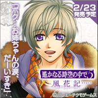 誓いキスのように個人番外編かと思いきや キャラ全員のストーリーが詰め込まれたかなりの豪華な仕上がり。 プロローグと各二話ずつと考えると本編一本ぐらの シナリオになるんじゃないかなーとおもってみたり。 おかげでプロローグは5回プレイしたけどねー。 ちなみに今回は皐月さんはお休みのようです。 こちらも、全キャラ未クリアだったりするんですけど… まだ未クリアのノエルに一人できゅんきゅんしてました。 誓キスの漣といいSYKの玉龍といい こういう無口だけど好き好きオーラーが激しいというか(えっ?) 動物というか…母性本能をくすぐられるタイプも好きです! 早くノエル配信してほしいなーと本気で思いました!! とりあえず本編クリアした順であとは気分の流れで(笑) 悠月⇒千早⇒未来⇒ノエル⇒廣瀬な感じでした。 一通りのクリア感想。 ■悠月 遊園地を貸しきろうとしたり、温泉貸しきろうとしたりと いろいろ子供っぽいところがなんか可愛いです。 しかも無理やりのようにヒロインちゃんをお化け屋敷に連れて 泣かせて、反省したらしくやたら優しい彼も意外でよかったです。 なんか二人で温泉とかちょっと展開があれでしたが…(苦笑) ■千早 もっと大人な感じなイメージだったんだけどな。 なんか電車もマトモに乗れないのですか?!と驚いた。 スカイツリーネタもまぁよかったです。 倒れたおばあちゃんの介抱はさすがに医者って感じでしたけどね。 妹さんが好きです。 ■未来 一緒に動物園。いつもはかっこよくエスコートしてくれる彼ですが 今回はいろいろ上手く行かないようです。 それがなんか可愛くて愛しい感じであたしは好きでした。 未来の新しい一面よかったです★ ■ノエル もうかわいい!なんか仔犬!(笑) 口数は少ないんだけど傍にいて安心できる感じがいい。 しかもヒロインちゃんを庇って殴られるとか男前っ! まだ彼は本編をクリアしてないのであれですけど… そのギャップも好きです。楽しみだなー。 ■廣瀬 他のキャラ攻略時はあんまいい印象なかったのでどうかと思いましたが ヒロインちゃんもうまく相手を操縦してたのでいい感じでした。 なんかこう、思った以上に意外と大人だった。 次回の彼の配信が楽しみです。 とりあえずそんな感じでした。 PR 2012.11.04 Sun 21:22:56 鴻上 大和(番外編)鴻上 大和(こうがみ やまと) 番外編ストーリー。 今回の更新から本編と番外編の二本立て。 お得な気分はしなくもないが… せめて本編をクリアしたキャラの番外編を配信して欲しい ってのが本音です(苦笑) 個人的に、先に大和の本編をクリアしたかったよー!! なのでなぜ、大和がヒロインちゃんのことをぶう子って呼ぶのか そのへんがいまいちよくわからないよぅ(涙) それなら、第一弾の崇生から配信してほしかったなー。 とりあえず番外編はすごく短いです。 おまけ。ぐらいの感覚でのプレイがオススメ。 何度もいうようですが、本編をプレイしてないので 時間軸がよくわかりません。 お互いに同棲してるっぽいりなんかまとまってるっぽいけど まだ恋人じゃない…のかな? なんかでも、大和ってかなり几帳面なタイプなんですかね? うーん。イマイチわかりませんが、教師だしね。 展開は、生活費等を大和に甘えてるのが申し訳ないヒロインが バイトをしようとして大和に反対されたところで 勇太からわりのいいバイトの話が舞い込み。 受けたのはいいけど、頼んだ本人は別の仕事が入って無理になり 大和が代行を受ける。 ちなみにそのバイトはウェディングの模擬式。 なんだかんだで二人共いい感じで映像に使う写真撮ったり ドレスの合わせなんかしてみたり。 本番ではいつものメンバーがからかいまじりに式に参加。 誓のキスはフリだけで誤魔化すといってた彼ですが フリじゃなくて本当にキスされちゃって… 最後にしたかったからした。みたいなセリフを言われて終わりです。 うーん。まぁ…こんなもんかと思いつつ。 わかったことは…大和はツンデレ!以上!(待て) 早く大和の本編を配信して欲しいです。 あっスマートパスでって意味ですよ? 課金してまでプレイする気ないんです。 データーにお金出すのあんま好きくないので…(苦笑) 2012.10.27 Sat 09:01:32 天海(風花記)天海(あまみ) CV:諏訪部順一さん 祟ちゃんをクリアしてもギャラリーが全部うまってなくて あれ?ってなって某攻略サイト見たら「おぉっ!」ってなった。 あくまでも彼はおまけ程度の感覚でスチルが二枚しかないけど… 個人的に諏訪部さんのぇっロい声が聞けたので満足(笑) なんかもう…あたしの中で諏訪部さんはジェフリー演られてから 声がぇロい人になってます(爆) 彼はとりあえず、八葉をクリアして祟ちゃんクリアしたら 途中のリンドウ邸で「?」のイベントが発生。 そこから彼ルートに偏り始めて 最後の夜の決意であえて誰も選ばなかったらルート確定っぽい。 バットEDもあったけどあえて見てません。 なんだろう…。 前回の過程があるせいか今回の天海は実体みたいです。 ヒロイ