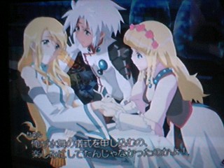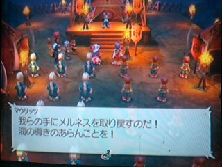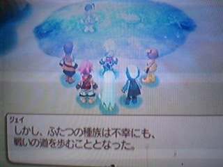 ぶっちゃけていえばそんなの知らねぇ!!(えぇぇ!) なんかもう…とりあえず奥へと進んでいけばいいんでしょ?見たいな感じで 何も考えずにガンガンと進んでいくのみ! 画面が切り替わるたびに敵と戦闘になるんですけど連続4戦ぐらいさせられて なんかイライラが積もった。 だから味方兵士が戦ってるの完全無視して(酷っ!)ひたしら突き進むのみ! だいぶとイライラしてたら…モフちゃんの援護か!!! ごめん…これすげー癒されましたよ!モフ族ラブ!!!!! ただ大好きなピッポが居ないのが残念でしたがキュッポとポッポも可愛いなー モフ族がピンチな度にひたすらテンション上げながら助けに向うあたしはバカです お前達ならいくらでも着いて来い!そしてあたしが守ってやる!とか思いつつも ジェイに反対されてジェイが代わりに仲間になってくれました! メンバーも揃ったことですしこれで艦橋へ向います はうーモフ族はほんまにかわぇぇなーVv 艦の中へと入ればいきなりメラニィのお出迎え! ここではとりあえず逃げるんですけど奥の扉が開かずに動き回って散々スイッチを探されました。 ここのパズルブースはあたしにはクリアできずに(ばかん) 弟にまかせて解いてもらいましたよ!!だからパズルブースは嫌なんだ!(怒) 苦労してパズルブースを出ればメラニィとの戦闘… 特に苦労もせずに奥へと進めばカッシェルと追いかけっこ。 なんかこやつが扉の鍵を持ってるかなんとかで追いかけるハメになるんですよ 余計な手間をかけさせられぐるっと庭を一周してもとの場所に戻ればやっと戦闘。 ここでは…ジェイが突っ込んでいって勝手に死んでた(ヴォォォイ!) もしかしてジェイって打たれ弱い? うぅ…リオン坊ちゃんで散々苦労させられた思い出があります あの時は…愛!!で育て上げたけどね!!!あんまり辛いとモーゼスに入れ替えようかな… 弟が薦めるから今んとこ一軍ですけどね(遠い目) とりあえずライフボトルの消費が恐いのでセネルとノーマで攻撃しつつウィルの回復でなんとか勝利 変な斧をなげつけるな!ばかっ!! この後はスティングルとの戦闘なのですけど…こいつほんまに大変やった! カウンターかますし即死攻撃してくるし!!! ライフボトルで復活させたら回復させる間もなく死んでるし! 思わず戦闘中はテレビに向って一人でブチキレてました!イラっと!ぼけぇぇ!! 一戦目は見事に全滅喰らって「うぎゃぁぁぁ!」って叫んだあとは負けじと再戦 今度はセネルに即死防止のアクセサリーを装備して… ここでもライフボトルが惜しいので死亡したジェイは完全無視の方向で ひたすらセネルの攻撃にやっとこの辺りでノーマがリザレクションを覚えてくれたので ノーマとウィルでひたすら回復!したら勝てた。 そんな感じで三人をぶっ倒せば…スティングルは逃げたけどね。 やっとこさ敵の大将であるヴァーツラフの登場! しかも止める間もなくいきなり砲撃ぶっ放してくれまして山が一つ吹っ飛ぶ惨事に(ぎゃー) まぁ…二発目打たせる前に戦闘になるんですけど… ここでも突っ込んでいったジェイが勝手に死亡して放置…(オィ) 完全にスティングル戦と同じような戦闘になりつつラストでタイムストップかけてジェイを復活させたら いいところをごっそりとジェイにもっていかれたーー!ひでぇや! でも諦めの悪いヴァーツラフったら兵器起動したまま死んでまうし(うげっ) 弾エネルギーを充電された兵器は二人を解放しても砲撃する気満々やし シャリーリーを再度兵器に繋いでも結局は止められないしで ……シャーリー使えぬぇぇぇぇ!! 結局は船と同化してたステラが命をかけてその砲撃を止めるんですけど そのまま亡くなってしますんですけどさ… あのさ…シャーリーってほんまに何にも出来ないんですね ただただ…イライラするばかりです(にっこり) 姉のステラは今まで何度もセネル助けたというのにお前は助けられるのを待ってるだけかい!! 同じ捕らわれの身でもクレアはもっと強い意志をもって自分なりにたたかったぞ!こんちきしょー! 2008.03.04 Tue 15:23:14 マウリッツの庵~ワルタもここに居たみたいです。やはしこやつは敵ではなかったんですね… 何やらここから少しややこしい話になってウィルの後ろにつく国と水の民が同盟を組んでこの戦争を終わらせる…とかいう感じに話がまとまります ウィルはその仲介役ってやつですね もちろん…セネル達はあとは戦争が終わるまで大人しくしてろと言われますが もっともな話なんですけどそうなればストーリは展開しませんからね(遠い目) 夜にこっそりと抜け出してぼんやりと空を眺めていたらクロエが登場してスティングルとの事を語ります なんか両親の敵っぽいよ… それで勝手にシャリーを助けにいこうみたいな感じになったら どこから現れたのかモーゼスとノーマもそれに賛同。 っておい!ウィル(回復役)がいないと後々辛いんですけど大丈夫か!? とか思ってたら次の日にイベントが起こって何やかんやらで(おいっ!) ワルターの代わりにささやきの水晶取りに